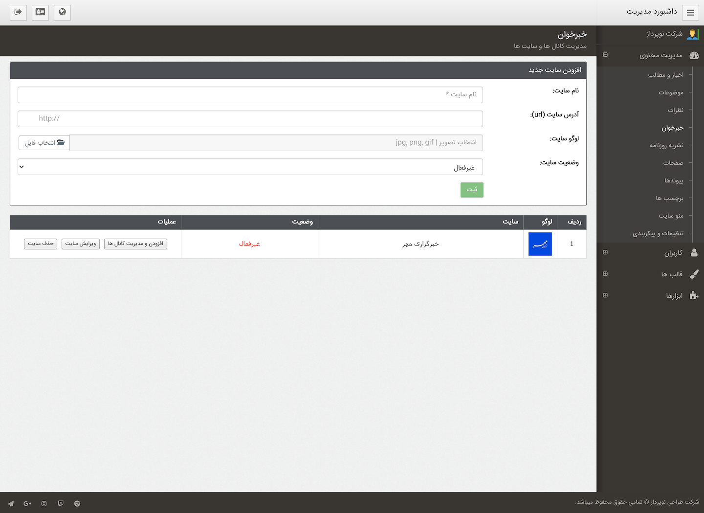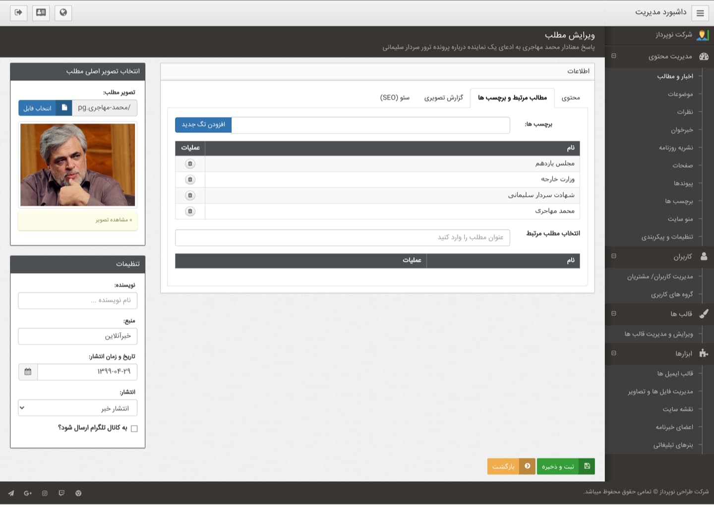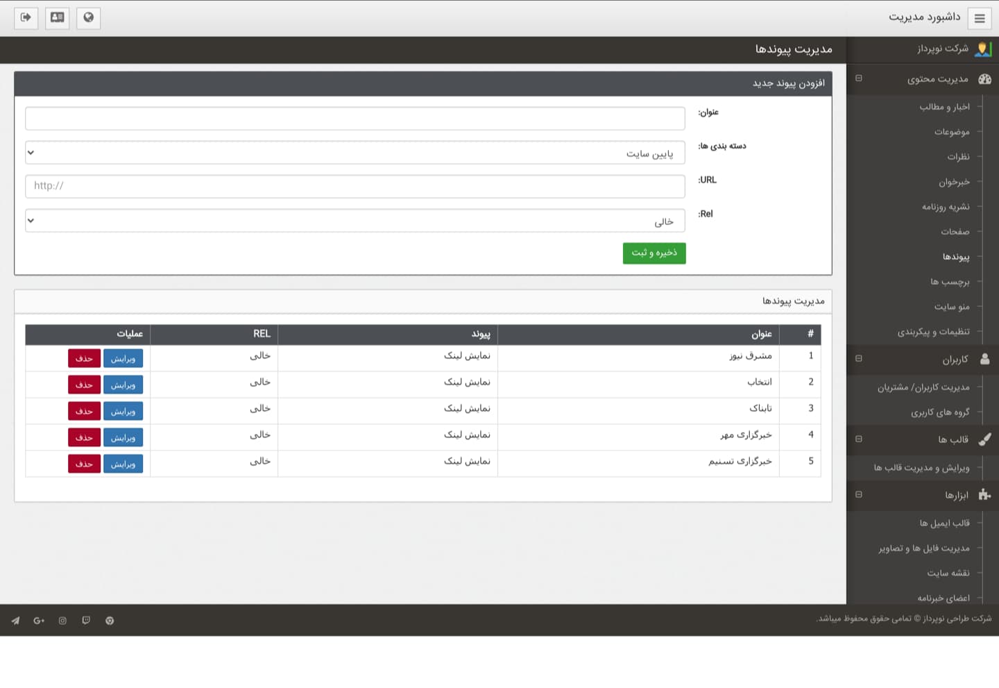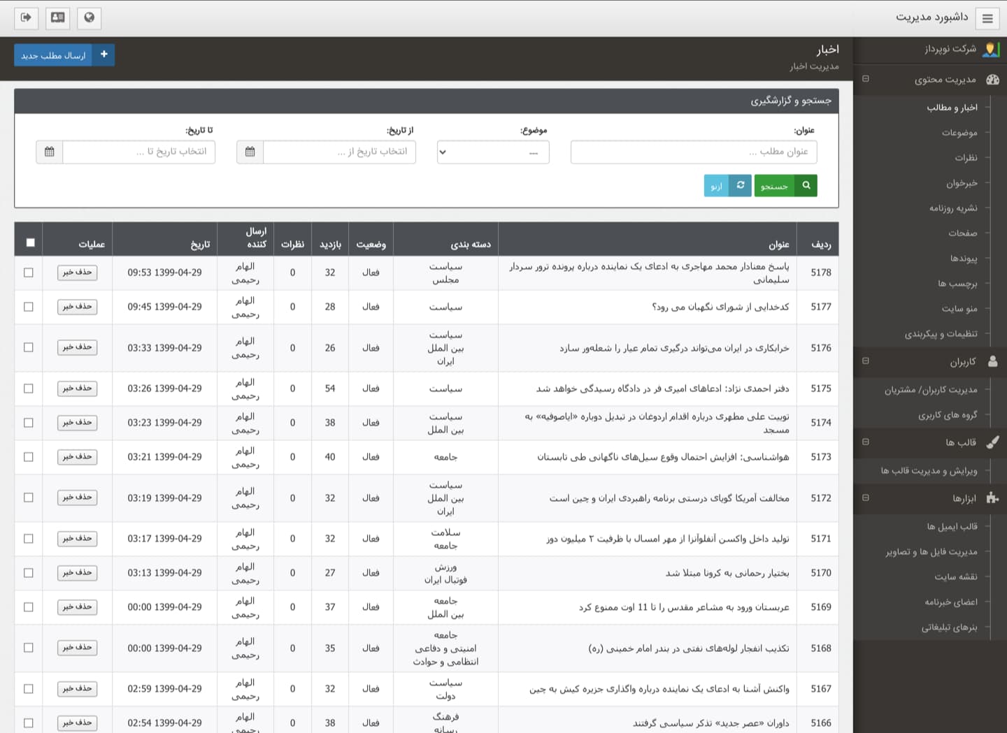 ما در پنل مدیریت خبری ایجاد شده توسط نوپرداز تلاش کرده ایم تا امکانات به ساده ترین و حرفه ای ترین روش برای شما قابل تغییر و دسترسی باشند. کاربرد آسان و حرفه ای سایت و به ثمر رساندن اساسی ترین خواسته های مشتریان از ملزوماتی است که در شرکت نوپرداز رعایت می گردد.