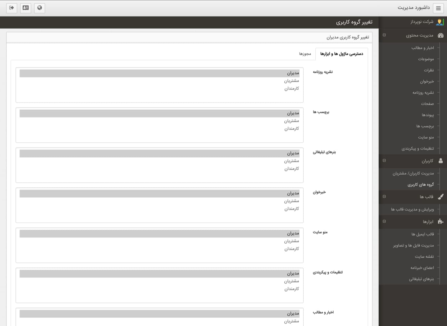 با توجه به این که در سایت خبری هر شخصی وظیفه مشخصی دارد بایستی در پنل سایت هر کسی به وظایف مربوط به حوزه کاری خود دسترسی داشته باشد. خبرنگاران از جمله افرادی هستند که با این بخش سایت زیاد کار دارند و دائم برای ارسال، حذف و یا ویرایش اخبار های خود به پنل کاربری خود وارد می شوند. به همین جهت ساخت سایت در شرکت نوپرداز بر اساس تعیین سطوح دسترسی انجام خواهد شد.