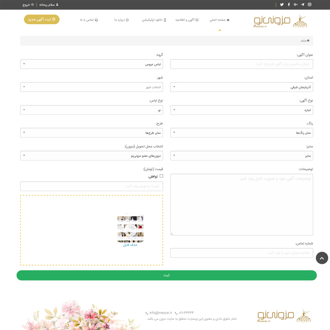 - امکان وارد کردن عنوان و انتخاب گروه - استان، شهر -نوع آگهی شامل (اجاره، خرید، فروش) - نوع لباس ( نو - پوشیده شده) - رنگ لباس - طرح لباس - سایز لباس - انتخاب محل تحویل یا همان مزون - وارد کردن قیمت ، توضیحات، تصاویر و در آخر ثبت آگهی