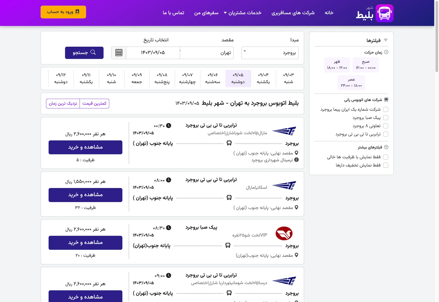 - امکان بررسی قیمت های بلیط ها بین شرکت های مسافر بری مختلف
